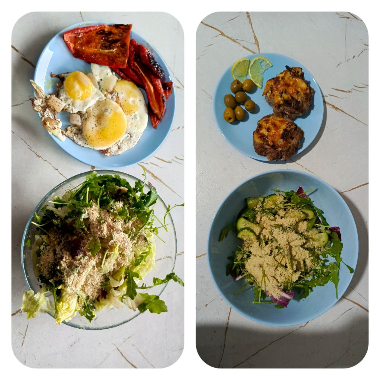 Завтрак: глазунья на домашнем сале (соль, перец); запечённые болгарские перцы (соль, чёрный перец, слив масло 82.5); салат - айсберг (чуть-чуть), микс салатов (руккола, радиччо, фриссе), пищевые дрожжи