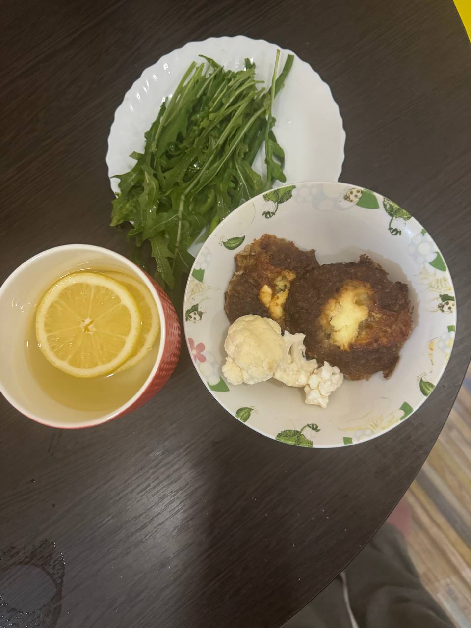 В обед была яичница,но я его не зафоткала 3 яйца с фаршем свино-говяжьим руккола и зеленый лук Это ужин Бургер + цветная капуста + руккола и зеленый лук