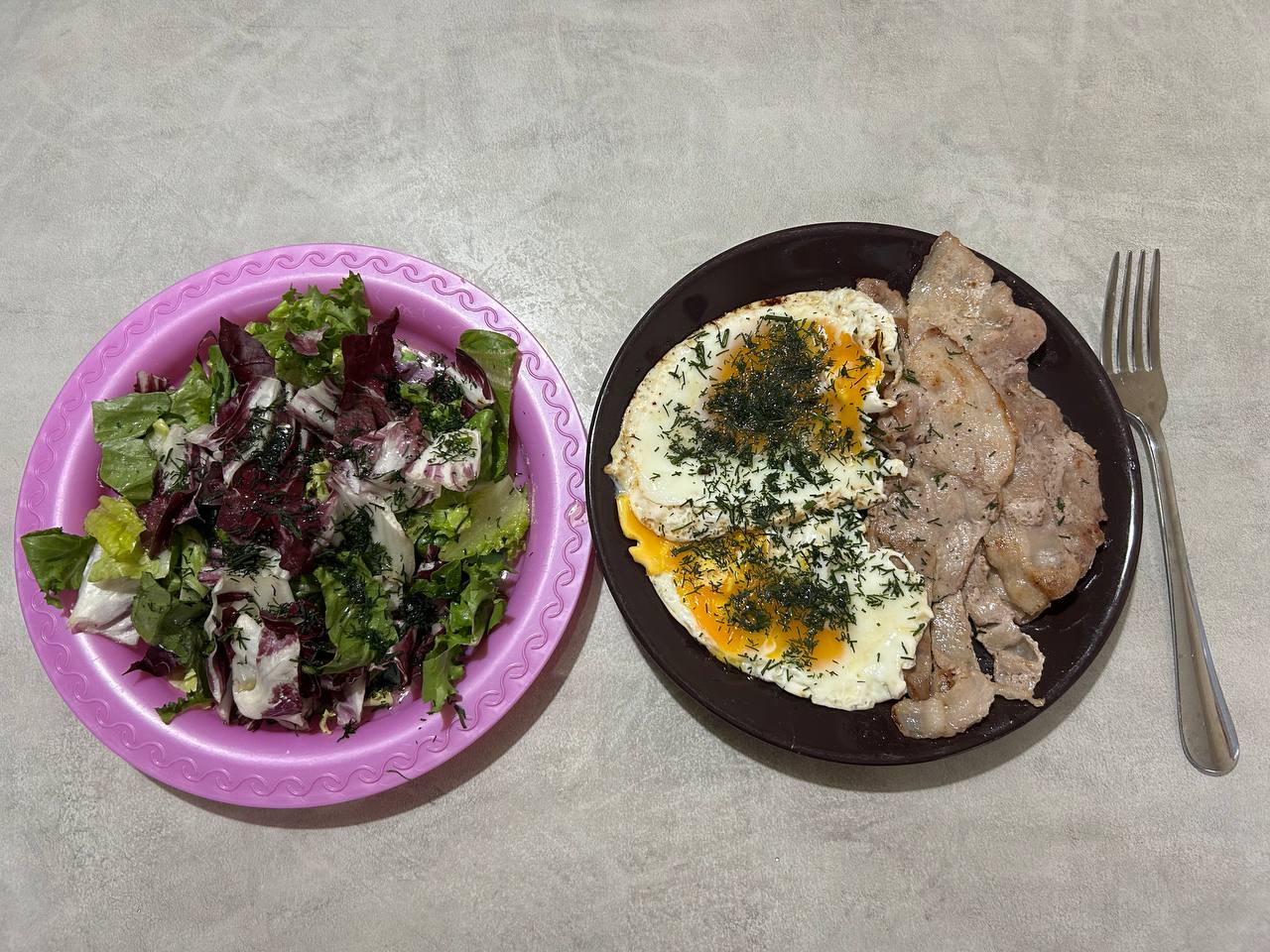 Обед : 2 яйца, бекон жареный, салат романо,Фриссе,радиччо, укроп. Ужин: салат романо, фриссе, радиччо, укроп, кето-бургеры, фасоль стручковая отварная .