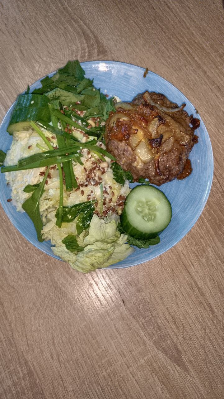 Утром яичница , вечером бургер , пекинская капуста зелень, с семенами льна и кунжут и оливковым маслом огурец