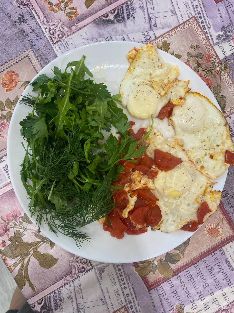 Добрый вечер! Сегодня кушала 2 раза. В 10 утра в в 17:00 вечера. Завтрак: яйца на масле ГХИ с помидором и зеленью. Ужин: Кето-бургеры по Олиному рецепту, брокколи, квашеная капуста и зелень🤗
